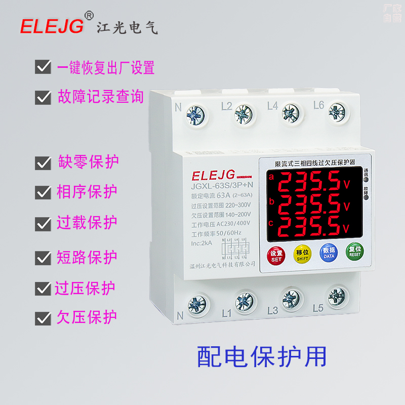 三相四线限流式过欠压保护器采用模块化的产品结构型式,具有体积小、可靠性高,操作方便等优点。产品主要功能有:过电压、欠电压、断相缺相、断零线缺零线、过电流、瞬时短路、三相不平衡、欠电流、相序、RS485通讯、一键恢复出厂设置等功能,广泛用于:电信、冶金、煤矿、钢铁、石化、港口、船舶、铁路、医院、智能楼宇等领域的配电和电动机保护控制系统。
