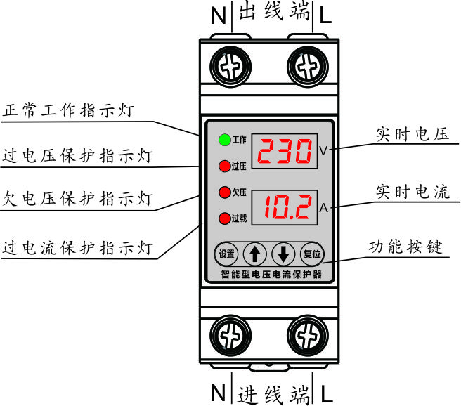 4、复位键:当发第一次过电流时,产品在延时规定的复位时间后,产品自动合闸,当第二次过电流时必须确定负载没有过载后,人工按复位键产品合闸,在设置状态时按复位键保存并退出设置状态。